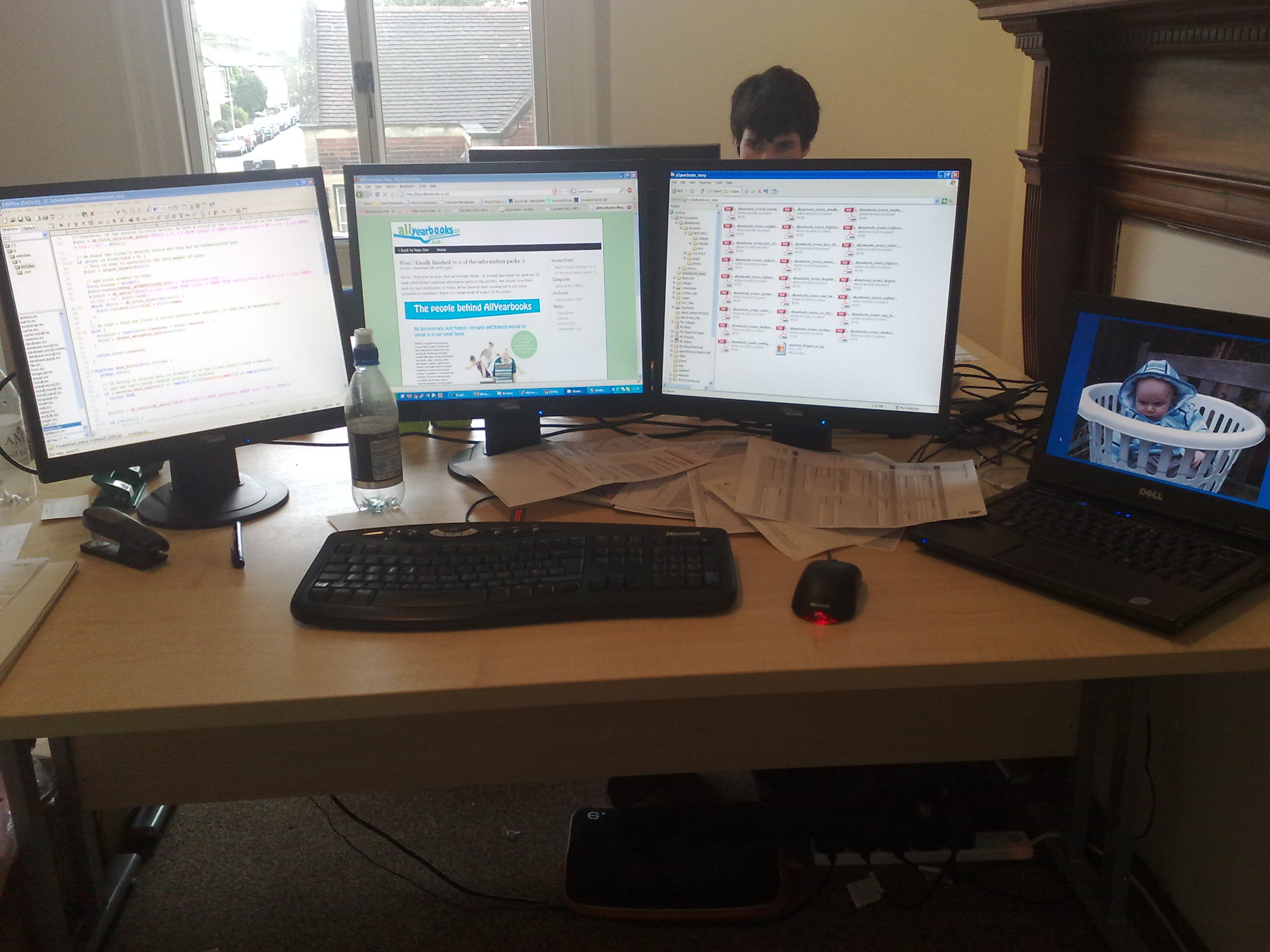 This is my desk. I have lots of monitors! They’re all connected to my laptop (far right) which is showing a picture of my baby Benjamin in the photo. The left screen is where I edit all the code that makes AllYearbooks work, the middle one usually has a web browser open, and the right one has a folder browser open most the time, or sometime another web browser.