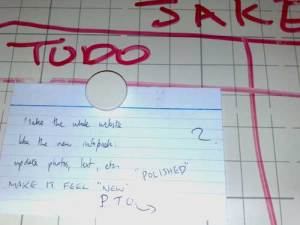 The image below is the dreaded ‘todo’ card. Its all part of the ‘agile’ system of software development. Whenever something pops up that needs to be done, we jot it down onto an index card and add it to the todo pile. Then once every Tuesday morning Jamey and I have a meeting where we go over all the current todo cards and figure out which ones we’ll both be tackling that week, and in what priority. This particular card has been sitting there staring me in the face for weeks!