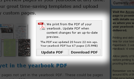 At any time as an editor of your yearbook can ‘Update PDF’… that is, re-create the a PDF copy of your yearbook taking into account all the changes members have made to their pages since the last time the PDF was created. You can then download the PDF, view it in your browser and even print it.