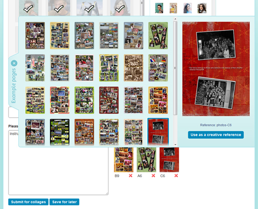 Finally, in the examples drawer you’ll find an assortment of collages that we’ve previously produced for other yearbooks. If you find one you like, simply click the “Use as a creative reference” button to support your creative instructions.