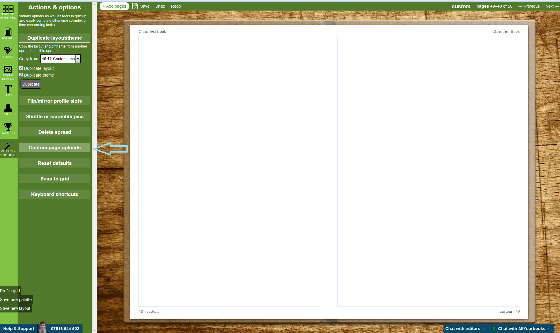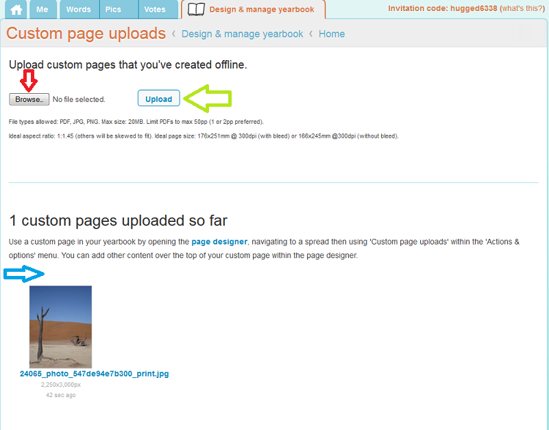 So once you’ve created your pages, you’ll need to upload them for use in the book. To do this click into the design and manage yearbook tab and then click the custom page uploads button (see red arrow)