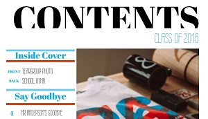 If you’re completely stuck for ideas, have a look at things you like to read and how they handle their own contents pages. You might find a magazine-like layout works wonders with the rest of your yearbook theming and they look super polished too!